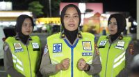 Polwan Tim Public Adrees Korlantas Polri Berikan Himbauan Pemudik di Rest Area