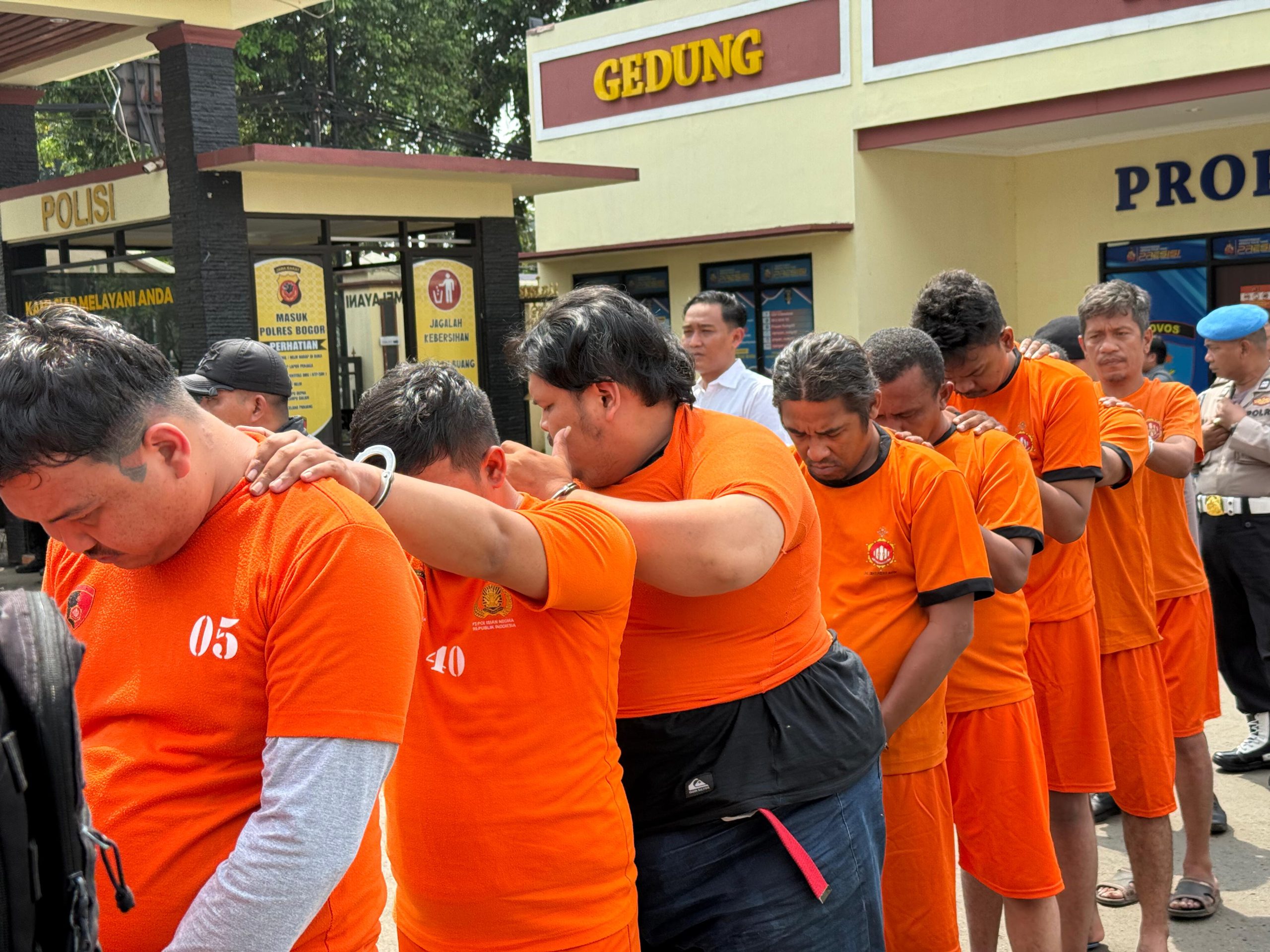 Konferensi pers digelar di halaman Mako Polres Bogor, Jalan Tegar Beriman, Cibinong, Jumat (9/5/2025). Barang bukti dihadirkan dalam konferensi pers tersebut.