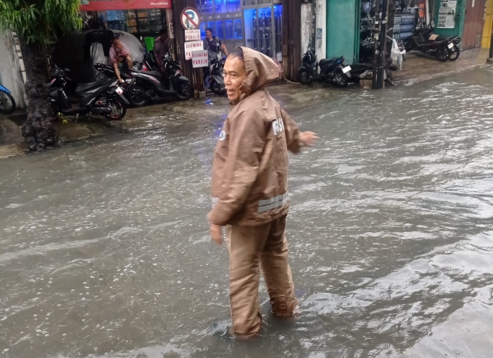Dengan senyum ramah dan penuh kehangatan, IPTU M Insan Arif hadir di tengah genangan banjir sambil menyapa warga yang ditemuinya dan warga pun sangat antusias menyapa balik.