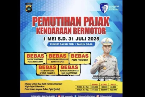 86NEWS.ID – PANGKAL PINANG – Direktorat Lalu Lintas Polda Kepulauan Bangka Belitung mengimbau seluruh masyarakat untuk memanfaatkan program pemutihan pajak kendaraan bermotor (PKB) yang digelar oleh pemerintah daerah mulai 1 Mei hingga 31 Juli 2025.