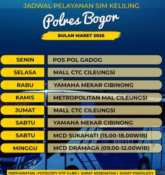 Layanan SIM keliling di Kabupaten Bogor beroperasi setiap hari dengan lokasi yang berpindah sesuai jadwal. Berikut rincian titik pelayanan untuk periode Maret 2026.