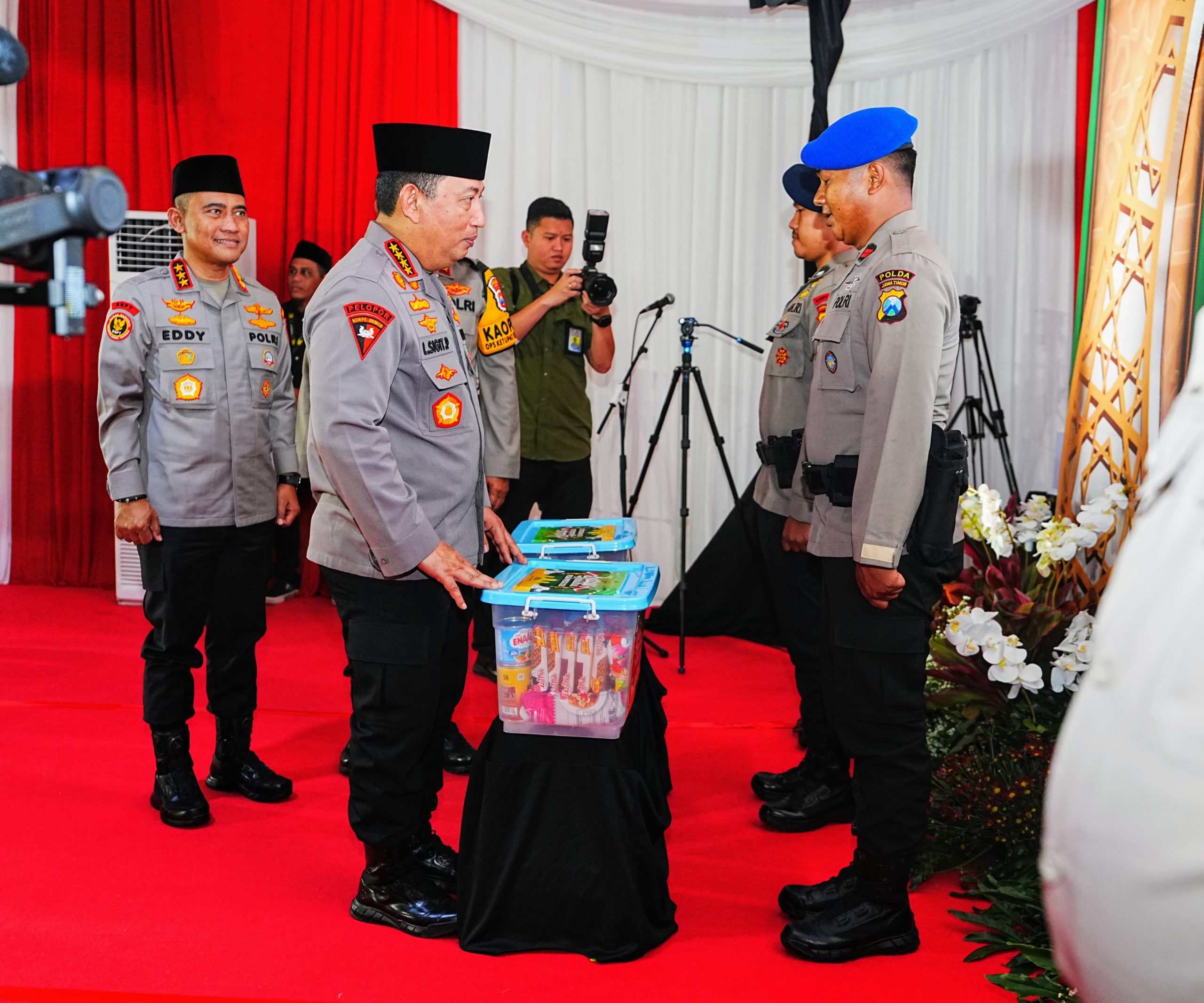 Jenderal Sigit juga menyambangi booth sembako dan menyerahkan paket sembako secara simbolis kepada perwakilan anggotanya. Empat perwakilan yang menerima paket sembako secara simbolis, yakni Bripda Surya Yuda Diorama (Ba Satbrimob Polda Jatim), Bharatu Relo Fambudi (Ba Ditpolairud Polda Jatim), Juru Rijan (PNS Yanma Polda Jatim) dan Abdul Kholiq (Remas Masjid Arif Nurul Huda Polda Jatim).