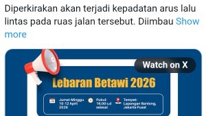 86NEWS.ID – JAKARTA – Ditlantas Polda Metro Jaya mengimbau masyarakat untuk menghindari ruas jalan di kawasan Lapangan Banteng saat gelaran Lebaran Betawi 2026 pada 10-12 April 2026.