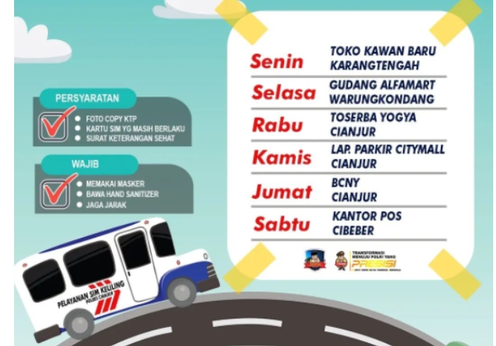 Bus SIM keliling hadir dan berlokasi di tempat strategis. Segera urus SIM Anda di jadwal dan lokasi SIM keliling Cianjur berikut ini: