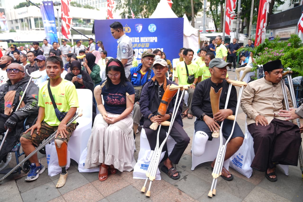 Tak hanya itu, Korlantas bersama Jasa Raharja juga menyerahkan bantuan berupa 20 kaki palsu, 25 kursi roda, dan 30 tongkat bagi penyandang disabilitas akibat kecelakaan.