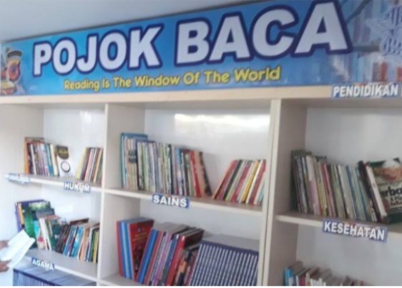Pojok baca yang dibangun di ruang pelayanan SIM Polres Garut berada di sudut ruangan pelayanan SIM. Dua rak besar tempat buku-buku tersebut dipasang memanjang di sudut tersebut.
