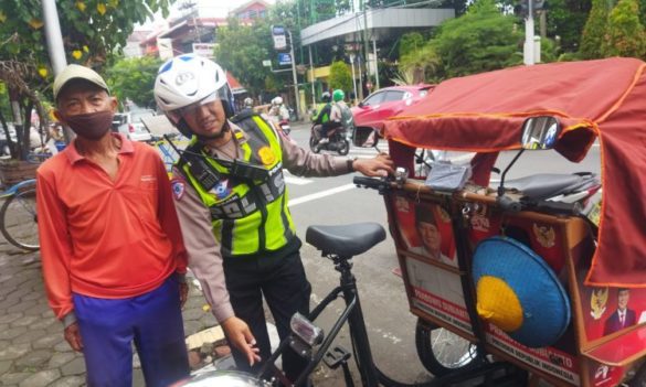 Kanit Kamsel Satlantas Polres Kediri Kota menyampaikan pesan keselamatan berkendara secara humanis. Para pengemudi becak listrik diingatkan untuk selalu mengutamakan keselamatan, kewaspadaan, dan kondisi kendaraan.