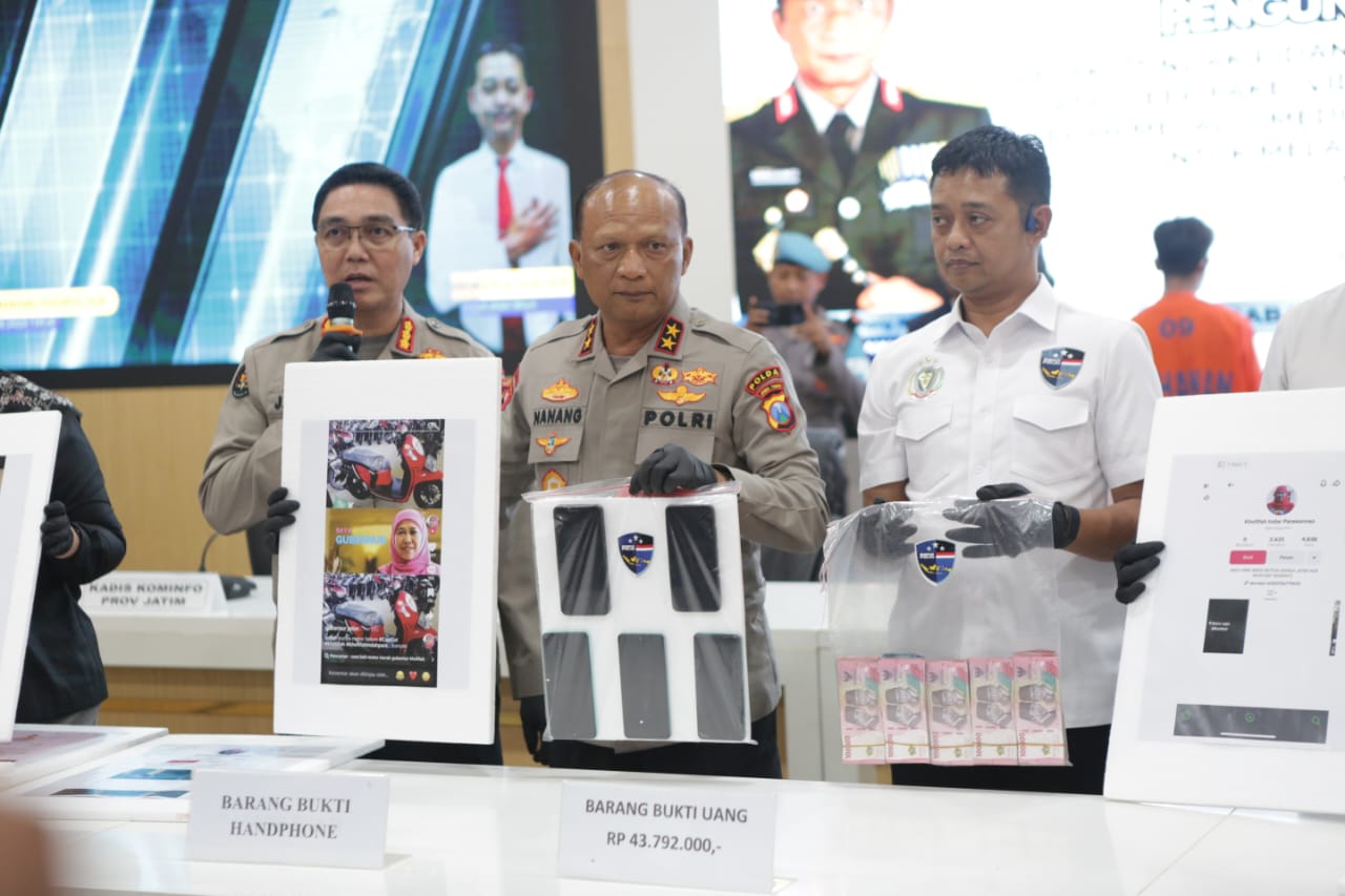 Pengungkapan ini disampaikan langsung oleh Kapolda Jatim Irjen Pol Drs.Nanang Avianto,M Si didampingi Direktur Siber Polda Jatim, Kombes Pol R. Bagoes Wibisono dan Kabid Humas, Kombes Pol Jules Abraham Abast saat konferensi pers di Polda Jatim, Senin (28/4/2025).