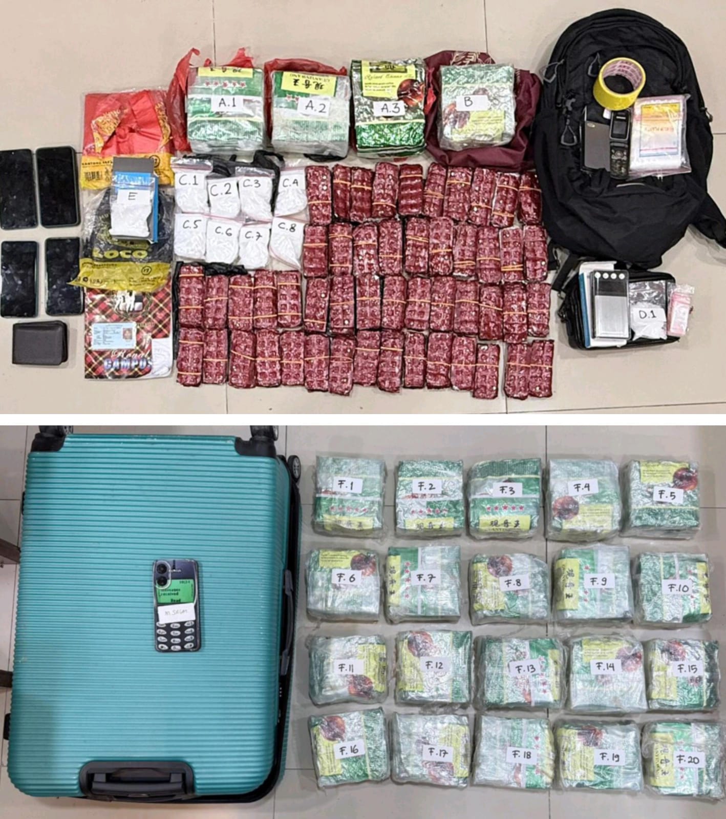 Di lokasi kedua tersebut, petugas mengamankan satu tersangka lainnya dangan inisial S. Saat dilakukan penggeledahan di dalam kamar, polisi menemukan 20 bungkus sabu dalam koper, yang seluruhnya dikemas menggunakan teh China merek Guanyinwang. Selain itu, ditemukan pula peralatan yang diduga digunakan untuk memecah dan mengemas ulang narkotika.
