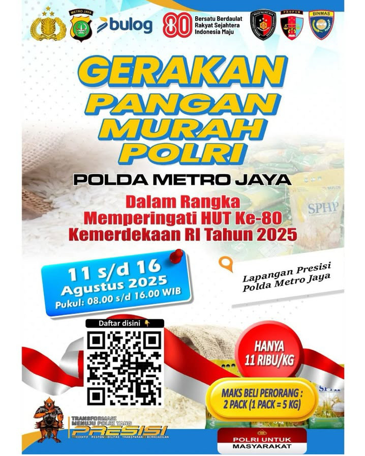86NEWS.ID – JAKARTA – Dalam rangka menyambut peringatan Hari Ulang Tahun (HUT) Kemerdekaan Republik Indonesia ke-80. Ditreskrimsus Polda Metro Jaya selaku Satgas Pangan akan melaksanakan kegiatan ‘Gerakan Pangan Murah Polri (GPMP) Polda Metro Jaya’ melalui penjualan Beras SPHP (Stabilitas Pasokan dan Harga Pangan) kepada masyarakat di lapangan presisi Ditlantas PMJ dari tanggal 11 hingga 16 Agustus 2025 mendatang.