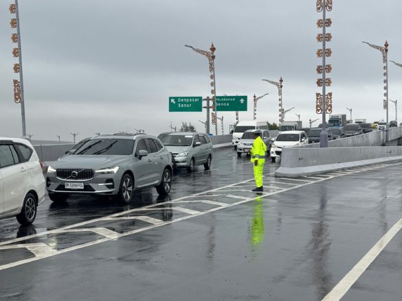 “Selamat pagi, ruas tol Bali bandara di gerbang tol Benoa diberlakukan antrean jalur roda empat dan roda dua. Berkolaborasi dengan Jasamarga setiap portal dan pintu tol dibuka untuk memperlancar arus lalu lintas kendaraan,” berdasarkan laporan petugas Polisi Lalu Lintas Polda Bali.