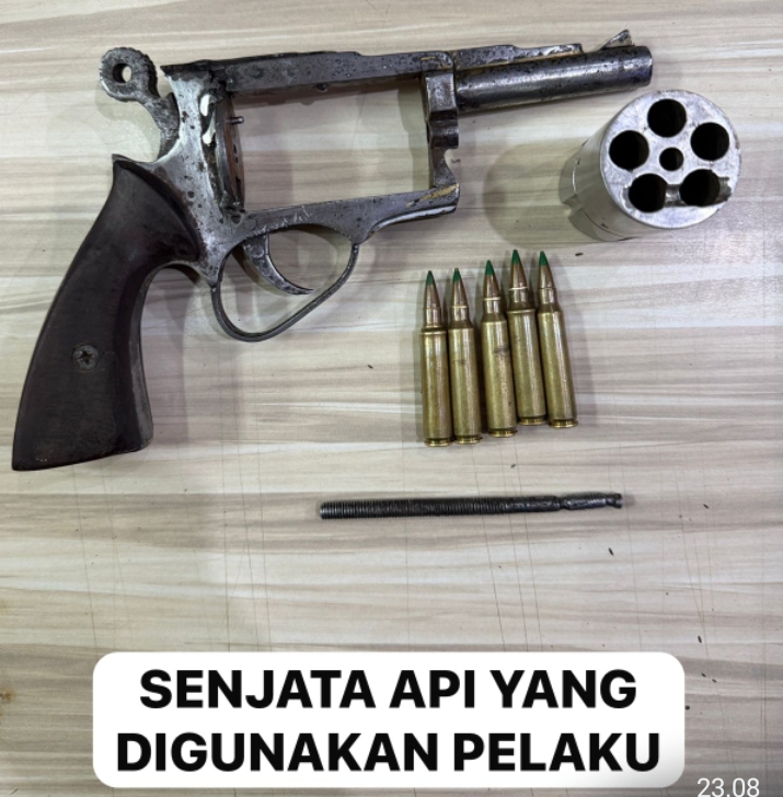 Dalam penangkapan tersebut, polisi mengamankan sejumlah barang bukti, yakni satu unit sepeda motor Honda Beat Street, dua unit handphone milik pelaku, tiga buah mata kunci letter T, satu buah gagang letter T, satu pucuk senjata api rakitan dan 5 butir peluru, rekaman CCTV, serta pakaian yang digunakan pelaku saat beraksi.