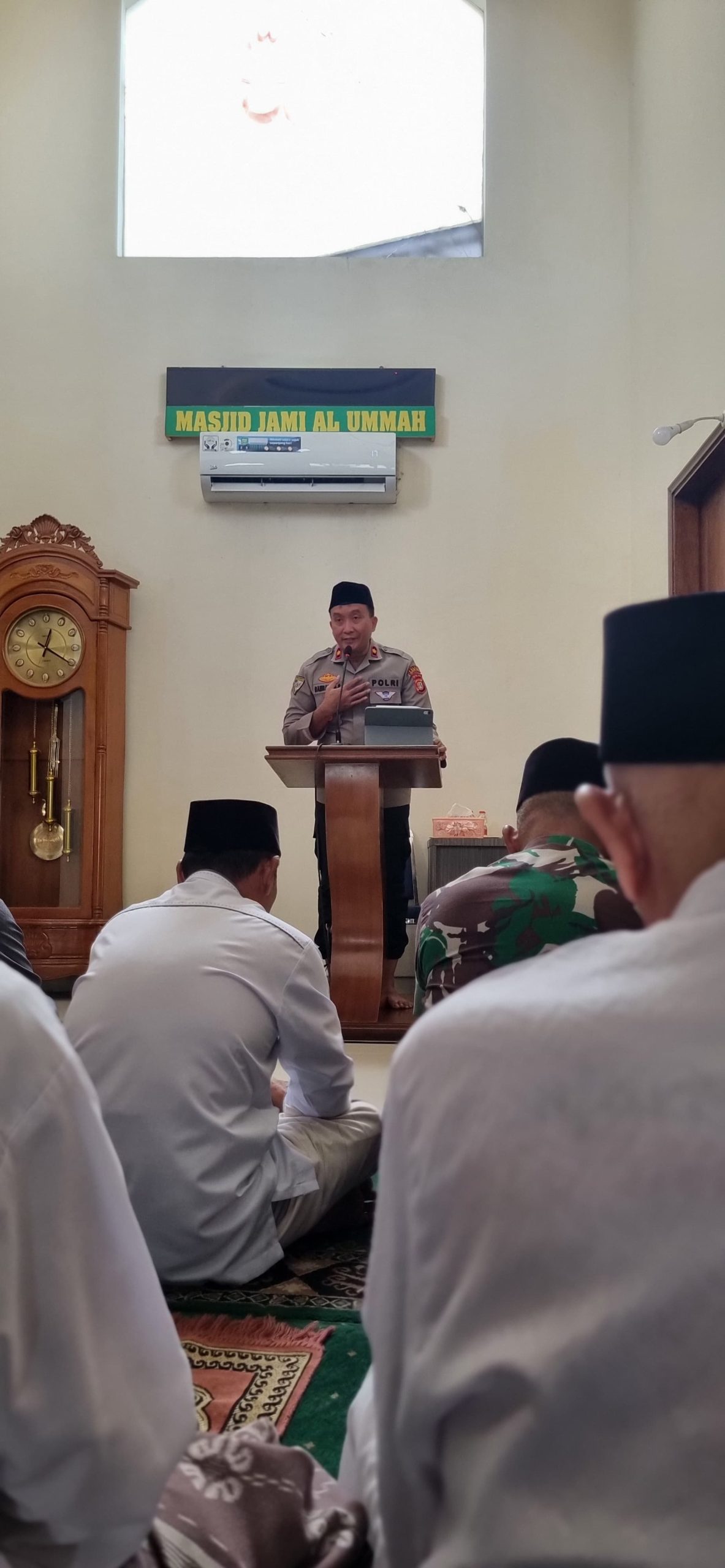Turut hadir Mayor Infantri Tarsan (Danramil 05 Ciputat), AKP Margana (Kanit Binmas), H. Maryadi (Ketua DKM Al Ummah), Maryoto (Ketua RW.04), AIPTU Andy Susilo (Bhabinkamtibmas Kel. Pondok Ranji), AIPDA Pawit Mujianto (Bhabinkamtibmas Kel. Jombang), BRIPKA Ahmad Suryadi, S.H. (PS Kasi Humas), SERTU Endang (Bhabinsa) Serta sekitar 200 jamaah Masjid Al Ummah.
