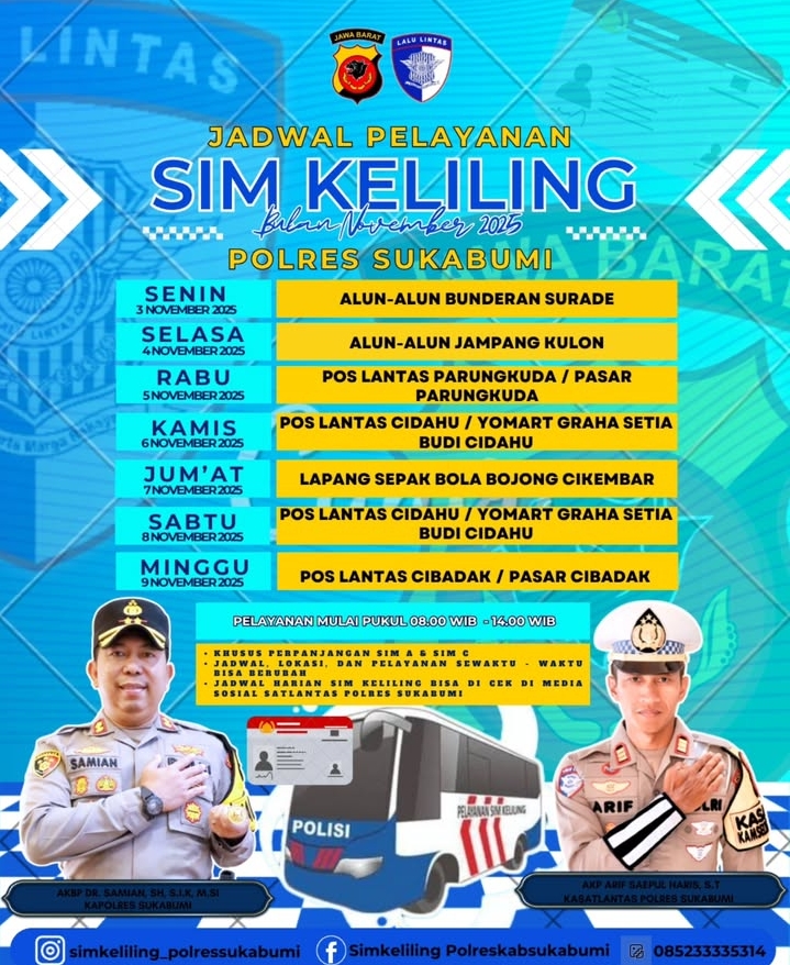Layanan SIM Keliling Sukabumi tersedia setiap hari dari Senin-Minggu dengan jadwal dan lokasi sebagai berikut, berdasarkan informasi Ditlantas Polda Sukabumi.