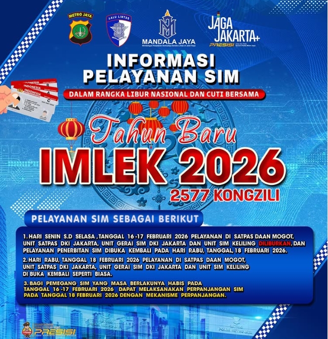 “Pelayanan penerbitan SIM dibuka kembali pada hari Rabu tanggal 18 Februari 2026. Bagi pemegang SIM yang masa berlakunya habis pada tanggal 16-17 Februari 2026 dapat melaksanakan perpanjangan SIM pada tanggal 18 Februari 2026 dengan mekanisme perpanjangan,” demikian penjelasannya.(Djn).