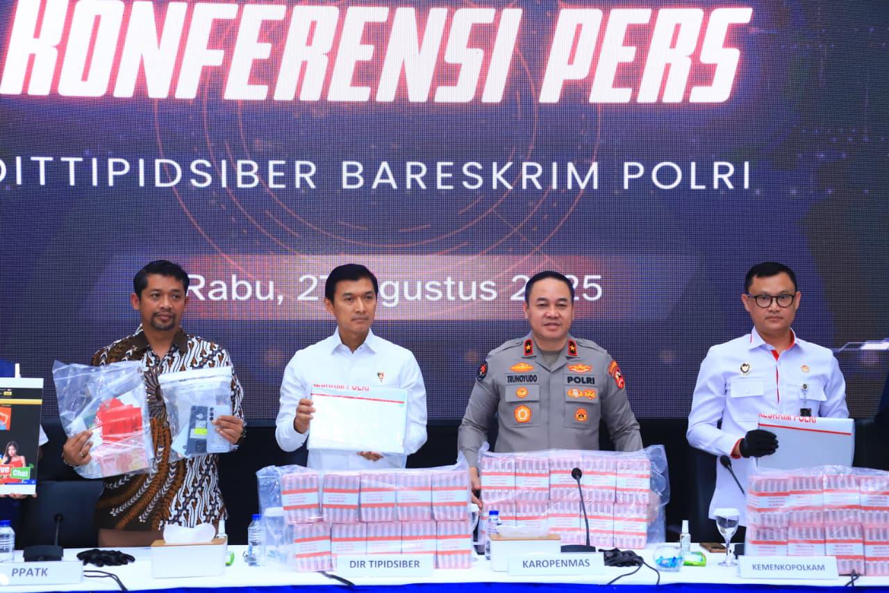 Pengungkapan ini disampaikan dalam Konferensi Pers Dittipidsiber Bareskrim Polri di Gedung Awaloedin Djamin, Bareskrim Polri, Jakarta, Rabu (27/8/2025). Hadir sebagai narasumber Dir Tipidsiber Bareskrim Polri Brigjen Pol Himawan Bayu Aji, Karopenmas Divhumas Polri Brigjen Pol Trunoyudo Wisnu Andiko, Deputi Analisis dan Pemeriksaan PPATK Danang Tri Hartono, Asisten Deputi Koordinasi Pelindungan Data Kemenkopolkam Syaiful Garyadi, dan Direktur Pengendalian Aplikasi Informatika Kemenkominfo Sofyan Kurniawan.
