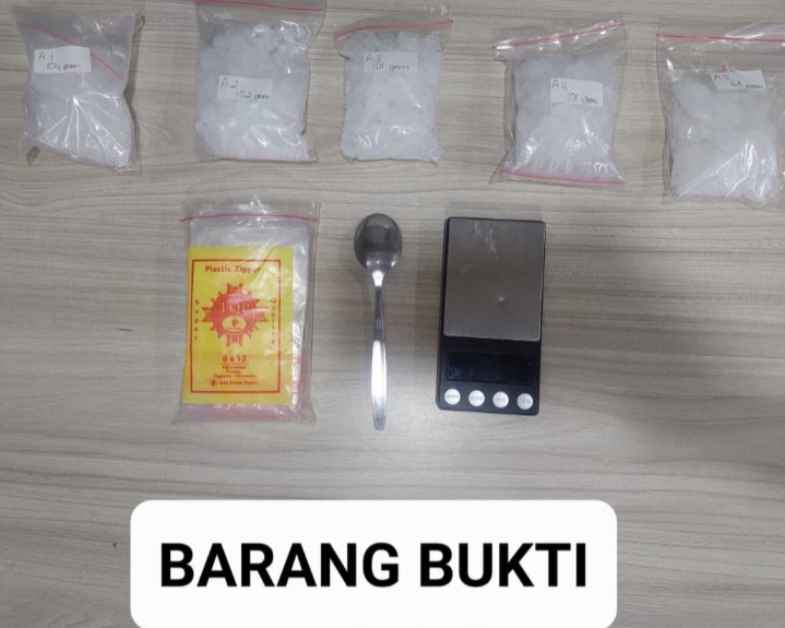 Dari hasil penggeledahan, polisi menemukan sejumlah barang bukti berupa Sabu 476 Gram, Catridge berisi Etomidate 13 Pcs dan 62 Pcs Happy Water Bubuk.