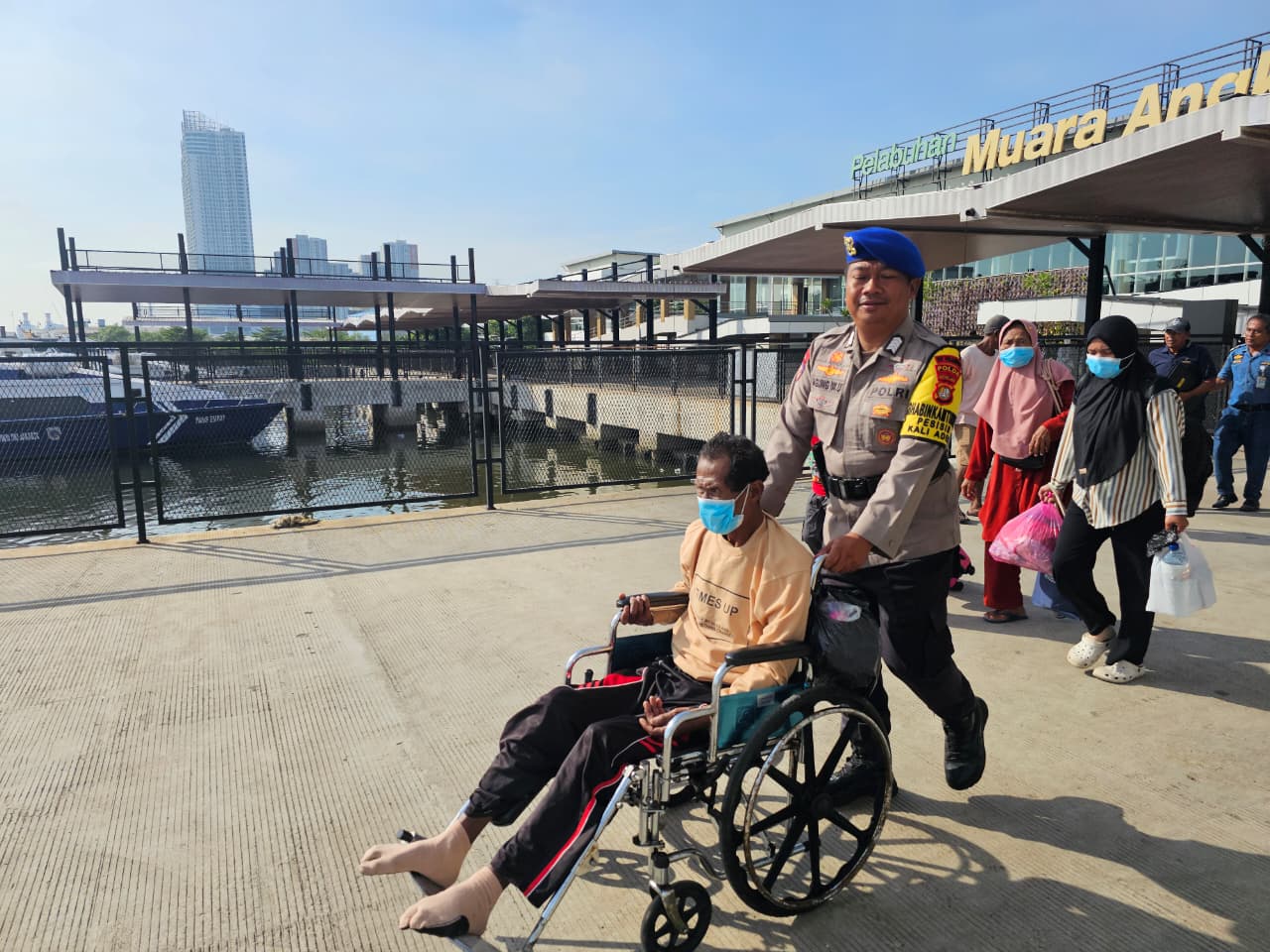 86NEWS.ID – JAKARTA – Personel Ditpolairud Polda Metro Jaya membantu penumpang berkebutuhan khusus saat proses penyeberangan di Dermaga Kali Adem, Muara Angke, Jakarta Utara, Sabtu (11/4/2026). Aksi humanis ini terlihat saat petugas mendorong kursi roda penumpang untuk memastikan proses naik turun kapal berjalan aman dan lancar.